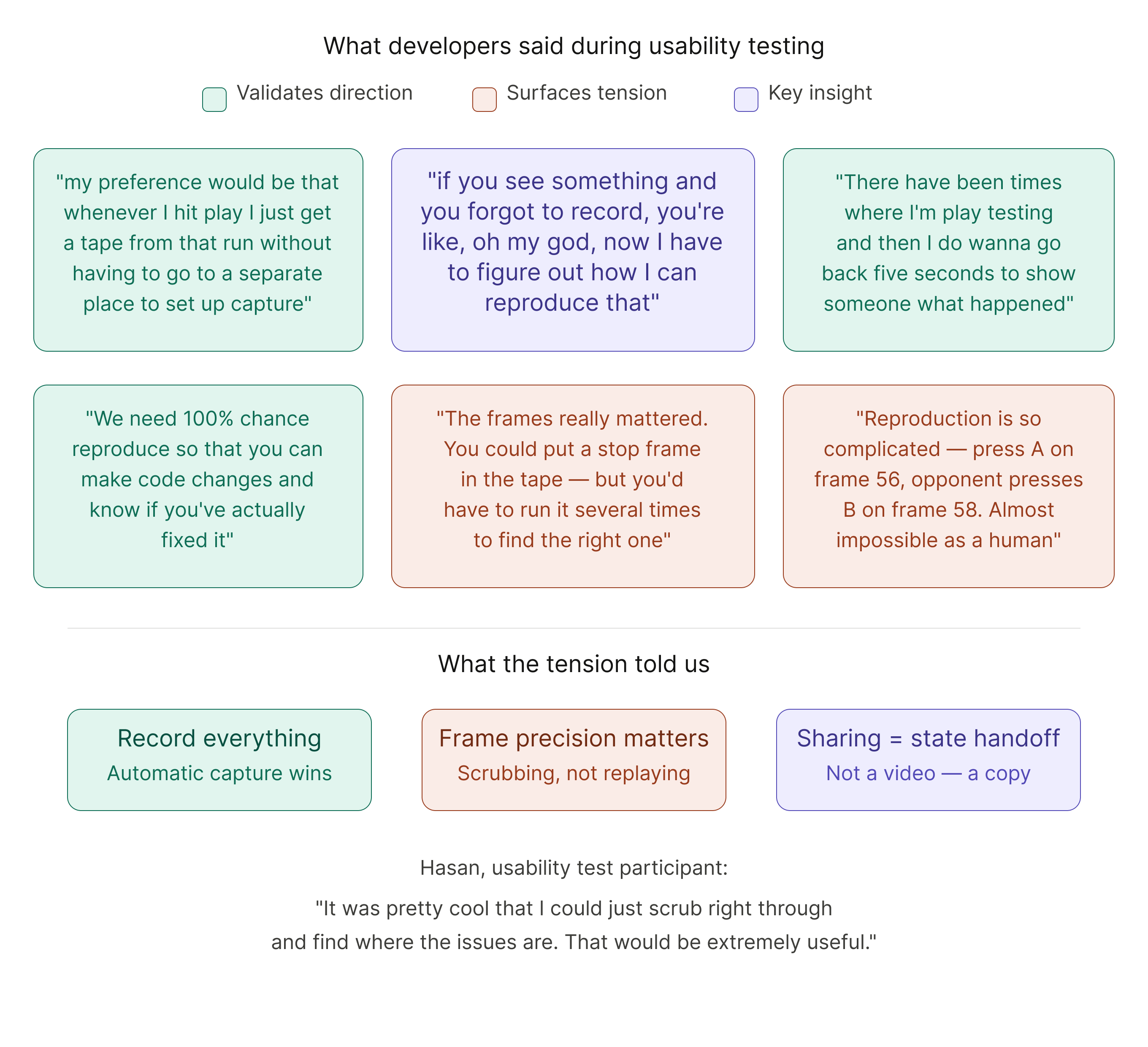 The second major tradeoff was scope. We could have built Tapes as a solo debugging tool and shipped faster. Instead we pushed for the collaborative layer: tagging teammates to specific moments, discipline-specific tracks. Because research showed that the most expensive bugs were the ones that required handoffs between disciplines. That added complexity and time, but it was the difference between a useful feature and a differentiating one.