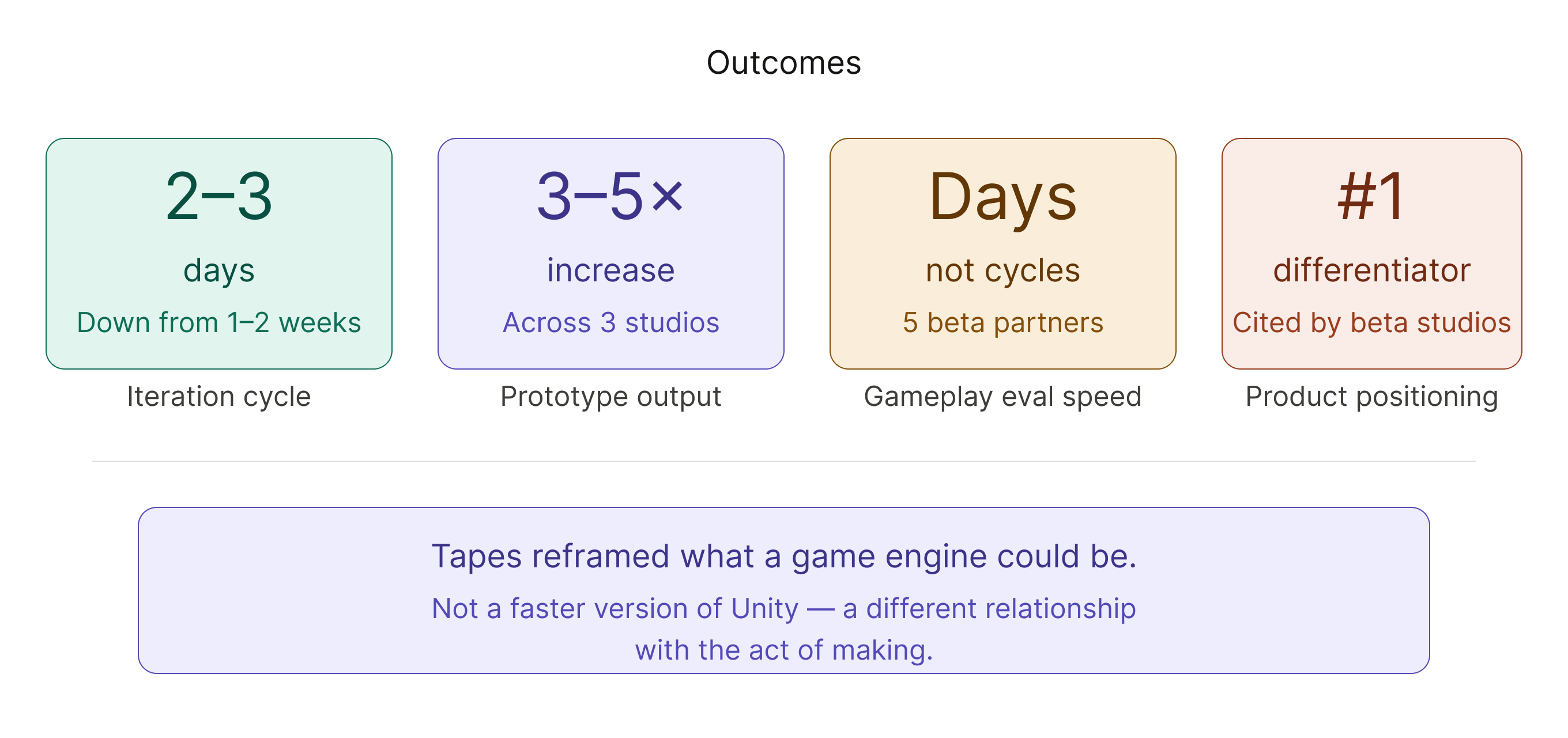 Iteration cycles dropped from one to two weeks down to two to three days. Prototype volume increased three to five times over, shifting engineering time from rework to forward progress. Beta studios evaluated gameplay changes in days rather than release cycles.